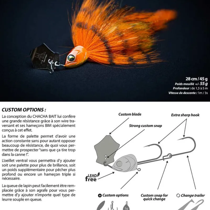 Le Chacha Bait se démarque également par sa modularité. Sa queue en lapin, connue pour ses mouvements vibrants et attractifs, peut être facilement remplacée grâce à un système d’agrafe intégré, permettant d’y fixer un leurre souple en queue si nécessaire. Ce système modulaire rend le Chacha Bait adaptable à une multitude de situations et de techniques de pêche, que ce soit pour cibler des zones peu profondes ou explorer des profondeurs.