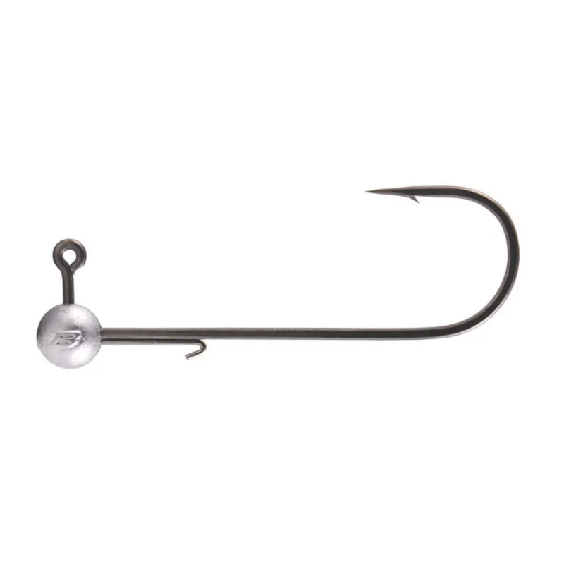 Tête plombée ronde sur hameçon moyen de fer très piquant. Elle dispose d’un petit ergot pour maintenir le leurre sans l’abimer, et du marquage poids/taille d’hameçons sur le côté. Une tête simple mais très qualitative.