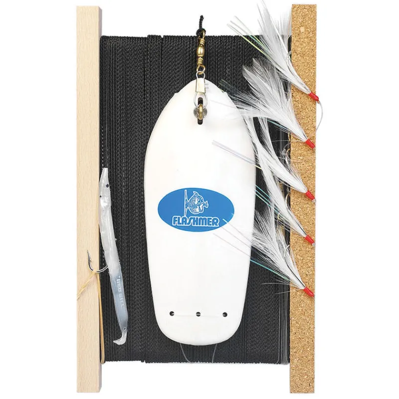 Cette ligne est composée d’un plioir bois et liège, d’une cordelette, d’une planchette japonaise, d’une tête de ligne en nylon et d’un bas de ligne monté avec 5 plumes blanches avec filaments et un lançon de 11 cm.