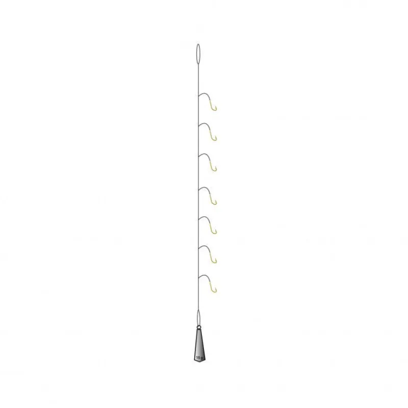 Bas de ligne composé de 7 hameçons dorés (longueur totale 150 cm). Empiles de 2 cm. Plomb 15 g raccordé à la ligne. Vendu sur plioir en mousse.