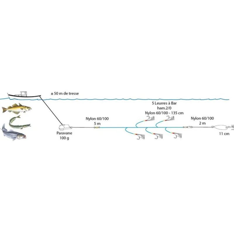 Longueur totale : +/- 60 m. Composition +/- 50 m de tresse, 1 paravane 200 g reliée par un baril à agrafe, 5 m de Nylon en 60/100 après la paravane, un émerillon anti-vrillage reliant le bas de ligne en 60/100 composé de 5 « leurres à bar » en N° 2/0, terminal de 2 m de Nylon en 60/100 avec un lançon bleu de 11 cm (hameçon N° 1/0).