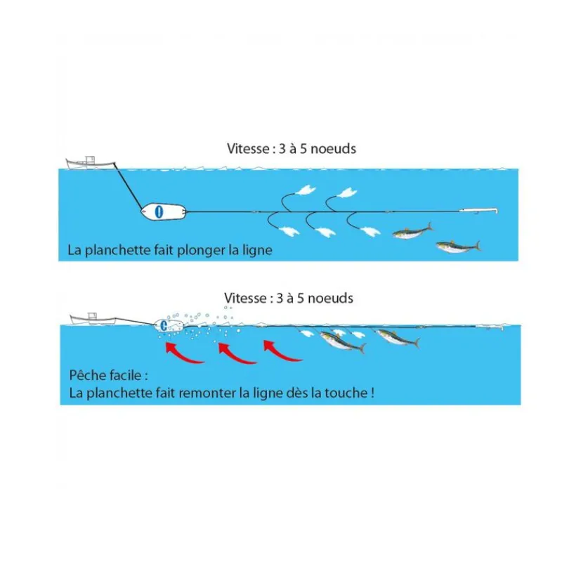 Cette planchette japonaise Flashmer se met en amont de montages en pêche à la traîne, elle descend automatiquement avec la vitesse du bateau et permettra ainsi de régler la profondeur de nage de vos leurres. Elle se retourne et remonte à la surface dès que la touche d’un poisson ou d’une algue se produit. Profondeur de pêche entre 2 et 6 mètres selon vitesse du bateau.