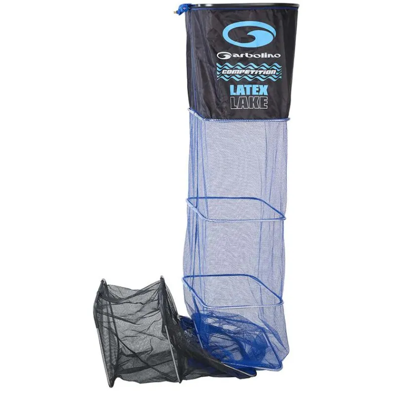 Bourriche en mailleLatex – Arceau de départ de forme demi lune 50×50 cm puis rectangulaire 50×40 cm.Arceau de départ noir puis bleu caoutchouté.Maille de 4mm puis 2mm sur les 2 derniers arceaux de colris noir.