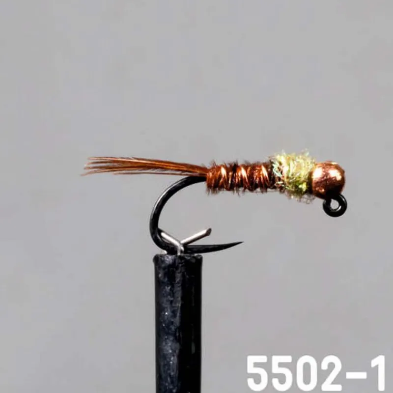 5502-1 : Nymphe légère et classée comme nymphe imitative. Modèle inspirée de la célèbre « Pheasant Tail ». Montage jig avec corps en faisan. Bille et cerclage en cuivre pour garder un aspect neutre. Ajout d’un thorax en fibres synthétiques couleur olive pour assurer de légers reflets et mettre en évidence l’imitation. Nymphe d’ensemble proposant un aspect naturel.