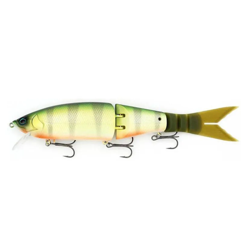 Swimbait d’une longueur totale de 210 mm, combinant un corps articulé en deux pièces avec une longue queue en silicone qui se meut de manière séduisante. Sa forme élancée assure une présence marquée et une excellente capacité d’attraction, tandis que sa configuration à trois hameçons réduit les risques de fausses touches ou de décrochage fréquents avec les grands swimbaits (un émerillon roulant est intégré à l’hameçon avant). Les articulations permettent un changement de mode entre une amplitude de mouvement large (mode flexible) et restreinte (mode serré). De plus, il est possible de choisir entre sans bavette, petite bavette, ou bavette plongeante, permettant ainsi une variété d’approches, du topwater jusqu’à une profondeur moyenne d’environ 3 mètres, grâce à la personnalisation des pièces.