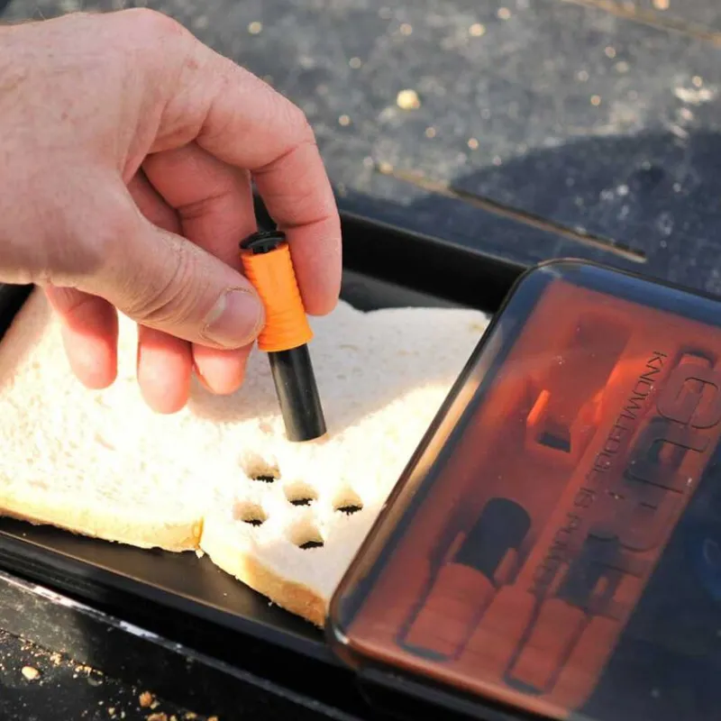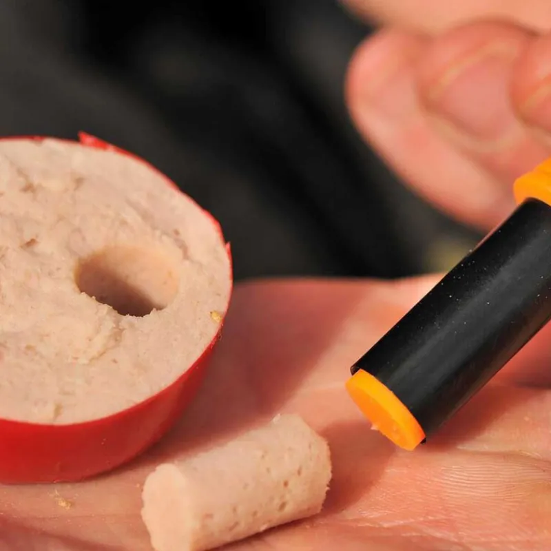 GURU a également travaillé sur le design de ce couvercle. Le but est de garder vos appâts en parfaite condition par temps pluvieux. Le couvercle est aussi teinté pour éviter que vos appâts ne se dessèchent sous les rayons du soleil. Lorsque vous ouvrez le couvercle, il se bloque à la hauteur de vos appâts. Si toutefois vous l’ouvrez entièrement, vous accédez au quatre emporte-pièces en acier inoxydable. Ils sont déclinés en 4 tailles de 6 mm, 8 mm, 10 mm et 12 mm qui couvrent de nombreuses situations de pêche, et vous permettent de « puncher » des appâts comme le pain, la viande ou encore les bouillettes. En déclipsant l’emporte-pièce, aussi appelé perforateur à poussoir, vous allez obtenir un objet compact et très pratique à utiliser : lorsque vous enfoncez l’emporte-pièce dans l’appât, le poussoir remonte, et en le pressant vous libérerez l’appât. Tous les emporte-pièces sont très tranchants, de façon à pouvoir perforer des appâts plus durs comme des bouillettes, du pâté dur ou de la saucisse : la coupure sera toujours parfaite et propre !