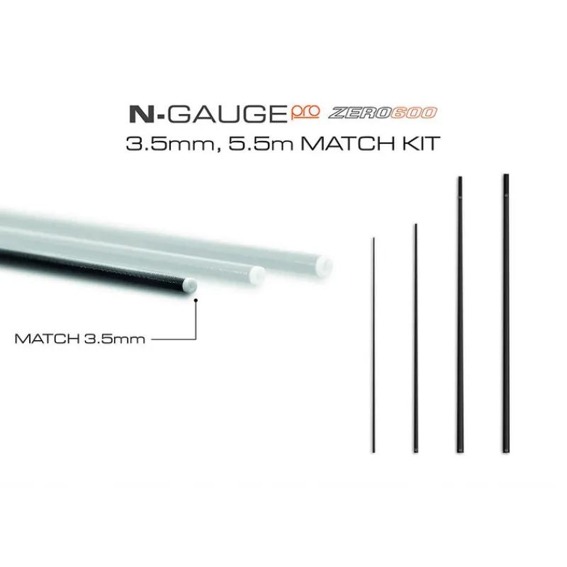 Kit de montage N-Gauge Pro Match 3,5 mm – Top 4 – 5,5 m. Ces kits de montage sont fabriqués en carbone ZERO600 haute résistance, ce qui les rend légers et rigides. Leurs pointes plus fines de 3,5 mm permettent d’utiliser des élastiques plus fins, parfaits pour la pêche aux poissons blancs.