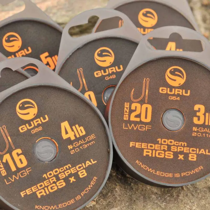 Les Spécialistes et les compétiteurs ont rapidement adopté les hameçons GURU spécial feeder LWGF. Ils sont désormais disponibles directement montés sur des bobines en mousse ! D’une longueur de 1 m, les hameçons montés LWGF FEEDER RIG 1M sont conditionnés par 8 sur une bobine en mousse et sont montés avec le nylon GURU N-GAUGE. Ces bas de ligne montés sont disponibles dans 6 tailles différentes :