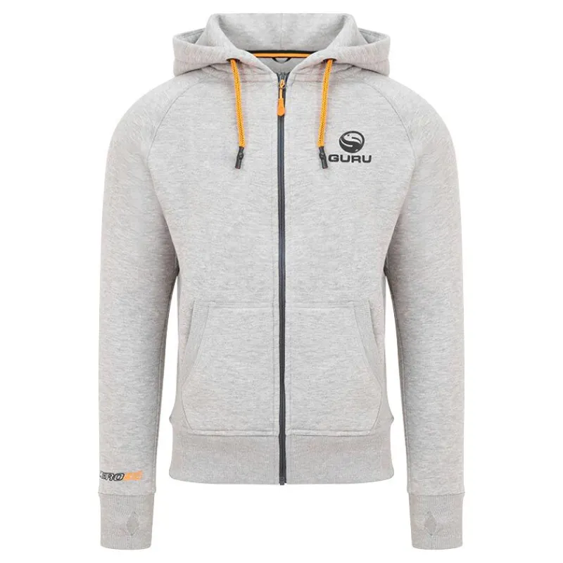 Le Grey Hoodie un sweat à capuche épais et chaud, avec un logo Guru sur le devant et en grand dans le dos. Des boutons à bascule/tireurs orange sur la capuche pour le serrage. Coutures élastiques aux poignets et à l’ourlet. 2 poches.