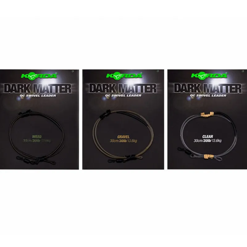 Le Korda Dark Matter QC Swivel Leader 30lb 30cm est idéal pour les montages avec plombs inline, Lead Clips standards ou montages coulissants (running rigs). Conçu pour offrir discrétion et efficacité, il garantit une présentation parfaitement plaquée au fond.