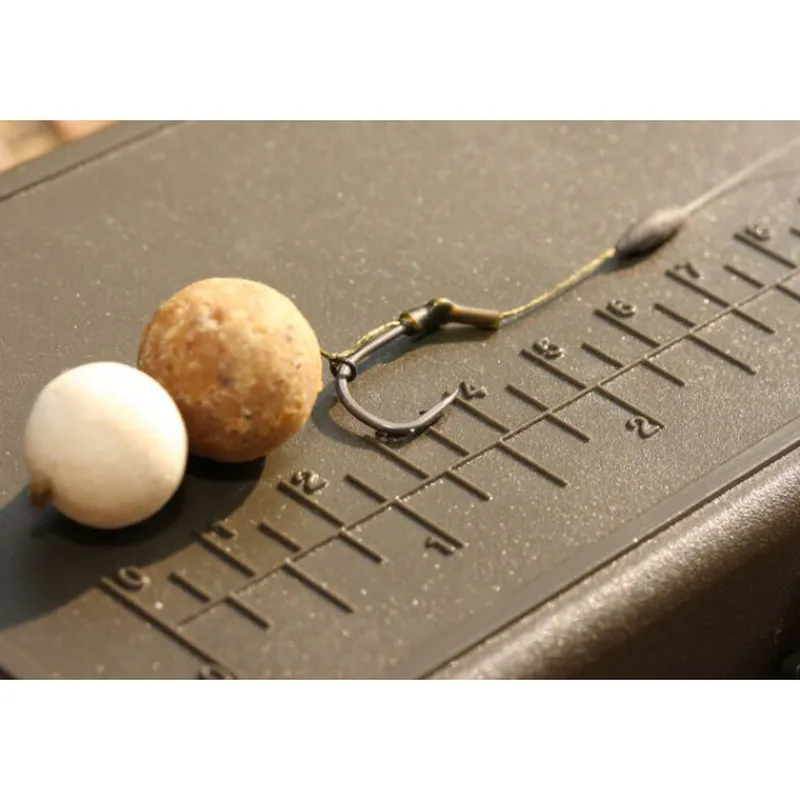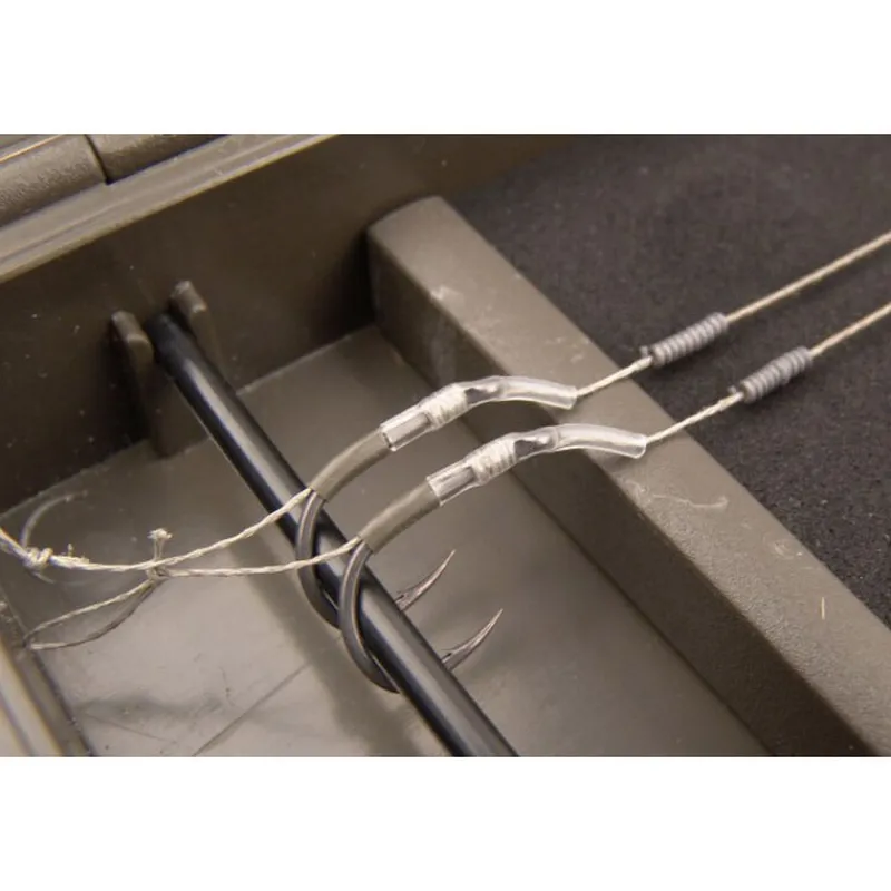 Les hameçons montés avec une gaine thermo, line aligner, les montages d-rig… pourront être stockés sans être déformés. En effet, sous la barre d’accroche, la forme incurvée de la coque abs autorise un rangement aisé pour ce type de montage. Il suffit simplement de ranger les hameçon avec la pointe vers le haut.