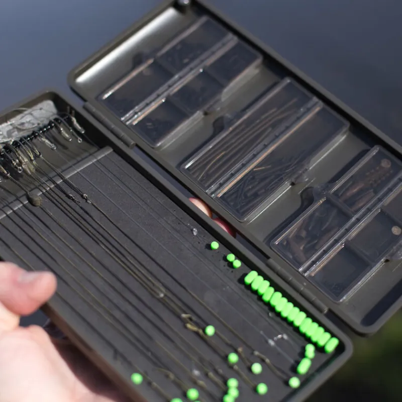 Afin de concevoir des bas de ligne à la longueur voulue, la face externe des boîtes à bas de ligne korda rigsafe combi est munie d’une réglette graduée.