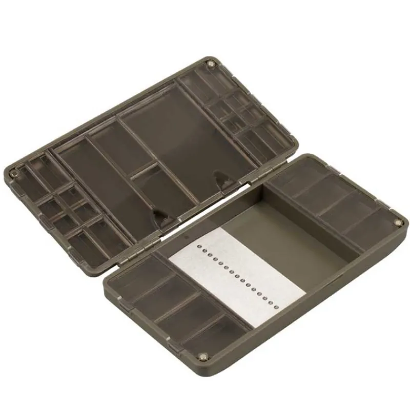 Cette boite de rangement Korda dispose de 29 compartiments avec des tailles différentes afin de venir y stocker facilement tous types d’accessoires. 28 des 29 compartiments sont pourvus d’un couvercle plastique évitant ainsi que vos accessoires ne s’en échappent. Le grand compartiment central est quant à lui ouvert (sans couvercle), permettant le rangement de vos outils tels que des aiguilles, des bobines de tresse pour vos bas de ligne, des ciseaux etc…