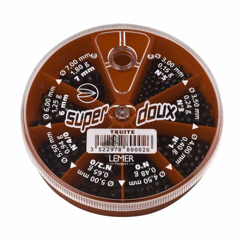 Boite distributrice 8 cases de plombs fendus super doux, parfaitement centrés et positionnables par simple pression des doigts sans marquer le nylon.
