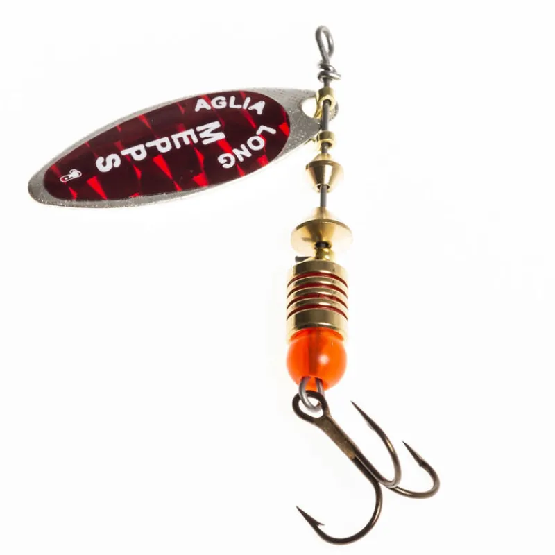 L’Aglia Long de Mepps est une favorite dans le monde entier. Moins nerveuse et plus régulière, elle donne une intense vibration. Elle tire beaucoup moins et est donc recommandée pour pêcher d’aval en amont ainsi qu’en eaux profondes. Comme la plupart des cuillères tournantes Mepps, l’Aglia Long est aussi disponible en version hameçon simple « siwash ». Les tailles 2, 3 et 4 sont assemblées avec un anneau fendu devant le trépied permettant ainsi de changer facilement l’hameçon pour un autre type tel qu’un Mino de Mepps ou n’importe quel autre choix du pêcheur. La qualité Mepps d’un bout à l’autre!