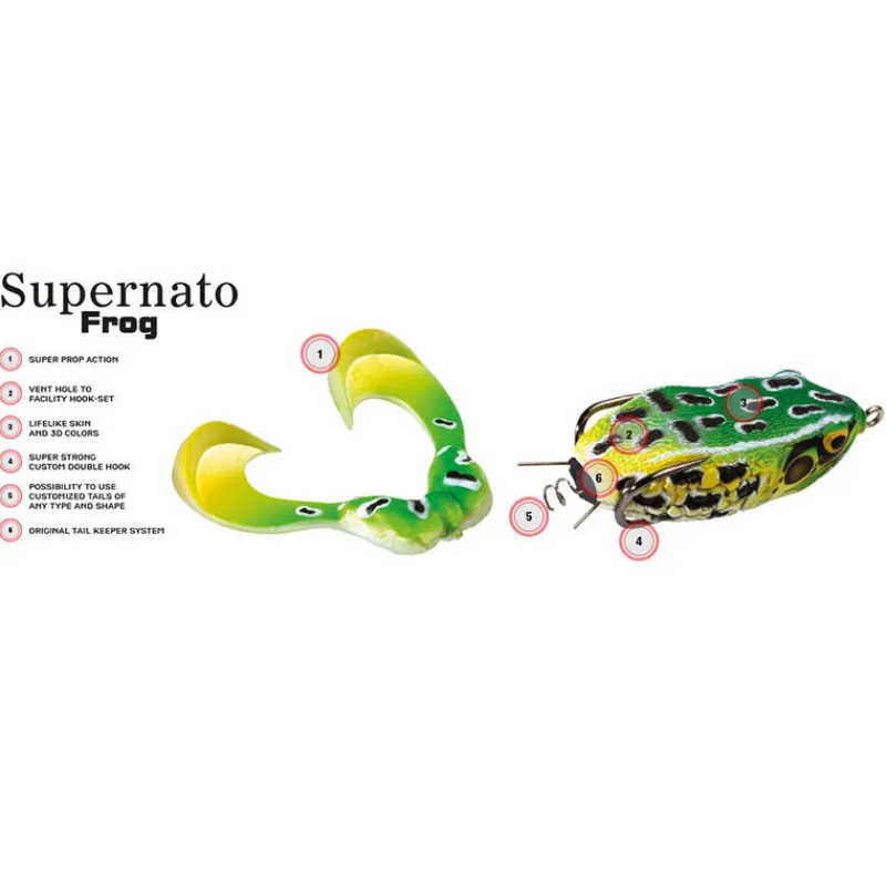 La Supernato Frog est équipée d’un hameçon double et robuste OMTD Custom. La Supernato Frog R est sans plomb, car ses poids internes sont fabriqués en bismuth, dans le respect de l’environnement.