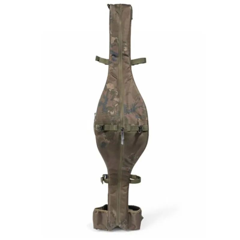 La pochette extérieure à la base du fourreau et les sangles de compression permettent de transporter des sacs de conservation, des mâts tempête, des lances bouillettes ou même des abris compacts à l’extérieur du fourreau.