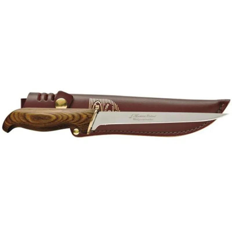 Le design nordique remis au goût du jour crée un look classique moderne. Cette version présente un manche marron avec une lame en acier inoxydable. Cette lame effilée parcourt toute la longueur du manche ( full tang ) pour un meilleur bras de levier.