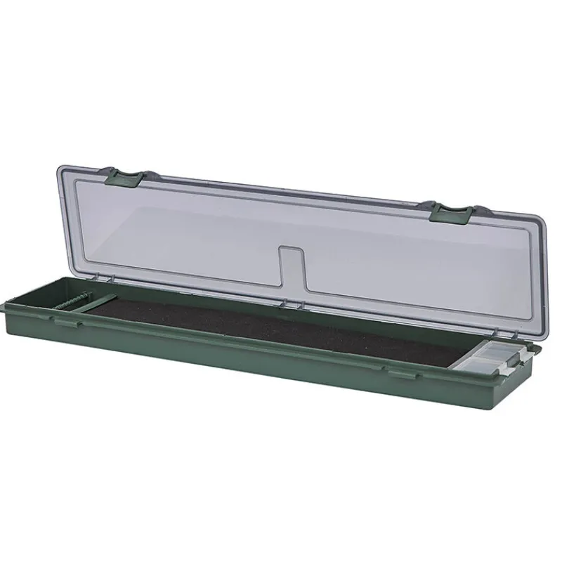 Grâce à son intérieur pensé pour le rangement (avec zone de maintien des rigs et espace accessoires), elle vous permet de préparer vos montages à l’avance et de les garder prêts à pêcher à tout moment. Le couvercle transparent offre une visibilité immédiate sur le contenu, pratique pour gagner du temps au bord de l’eau.