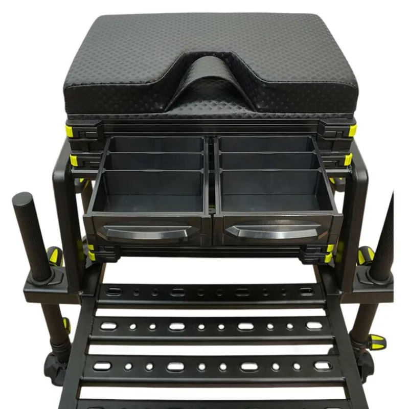 – 1 tiroir latéral 30mm compartimenté sous l’assise qui permet d’avoir un accès facile à vos petits accessoires en cours de pêche : il est parfait pour accueillir vos plombs, hameçons, sondes ou encore vos outillages tels que des ciseaux ou votre pince à plombs.