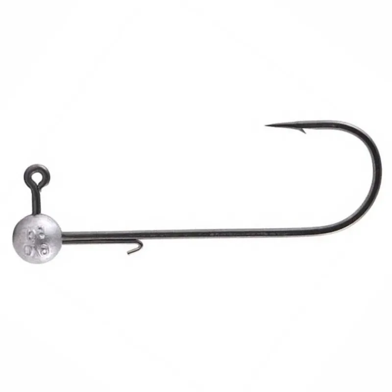 Tête plombée ronde sur hameçon moyen de fer très piquant. Elle dispose d’un petit ergot pour maintenir le leurre sans l’abimer, et du marquage poids/taille d’hameçons sur le côté. Une tête simple mais très qualitative.
