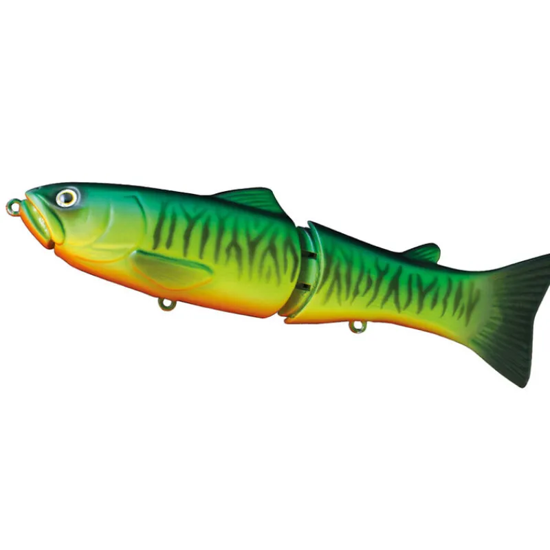 Swimbait mythique, le NEW SLIDE SWIMMER est clairement conçu pour la traque des poissons trophées : brochets, bass, silures, bars font partie de son tableau de chasse. Ce glide bait a été développé pour duper la méfiance des poissons éduqués, sa nage en »S » et sa finition sont d’un réalisme bluffant, les charnières articulées de son corps sont conçues pour ne pas faire de bruit. Son corps est en ABS très résistant et recouvert d’une jupe en silicone souple qui permet de créer effet ressort au niveau de l’articulation conférant à la nageoire un phénomène de propulsion. Ce procédé unique lui procure davantage de fluidité qu’un swimbait articulé classique et une meilleure réponse aux jerks. Le système « micro vibe » placé dans sa tête peut se déclencher lorsque l’on twitch le leurre, créant ainsi des micro-vibrations, même à l’arrêt. Slow sinking, il est possible d’ajouter un lest dans le logement situé sous sa bouche pour le rendre sinking.