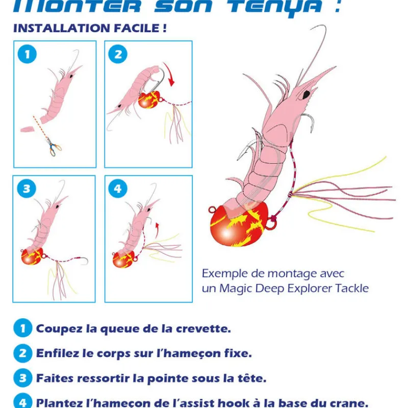 Idéale pour les pêche en dérive aux appâts, le tenya permet d’escher une crevette ou des gambas pour la pêche de nombreuses espèces dont la daurade, le pagre, le denti, le pageot, le sar, le tassergal, le poissons plats, le lieu et la morue, la vieille,… . La position naturelle de la tête permet à l’hameçon d’etre bien visible sur le fond.
