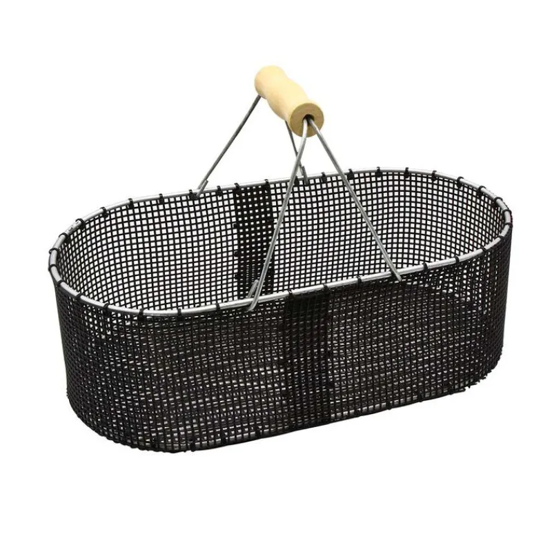 Panier à coquillage de forme ovale. Equipé d’une poignée en bois confortable. Maille en plastique de 10 mm, parfait pour les coquillages, poissons et crustacées.