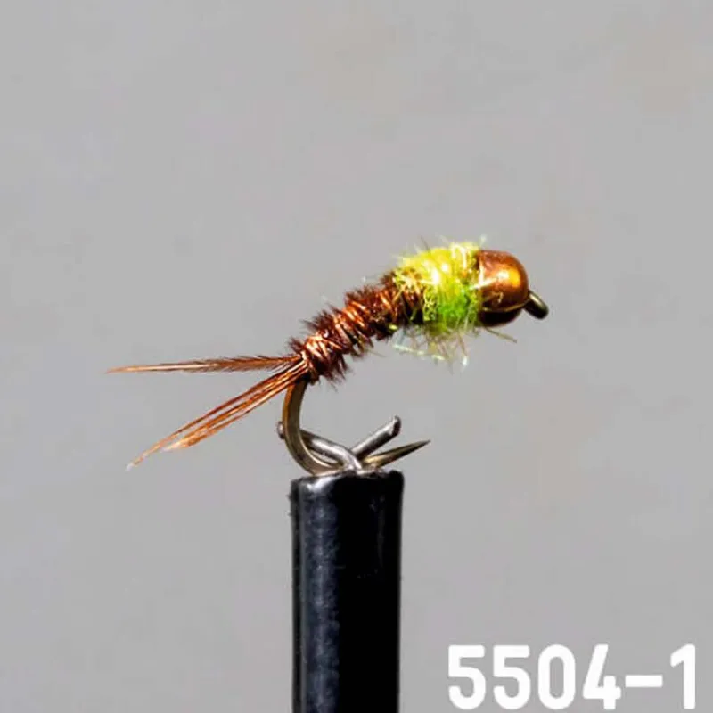 5505-1 : Nymphe courbée légère et classée comme nymphe imitative. Modèle inspirée de la célèbre « Pheasant Tail ». Montage avec corps en faisan. Bille et cerclage en cuivre pour garder un aspect neutre. Ajout d’un thorax en fibres synthétiques couleur olive pour assurer de légers reflets et mettre en évidence l’imitation. Nymphe d’ensemble proposant un aspect naturel.