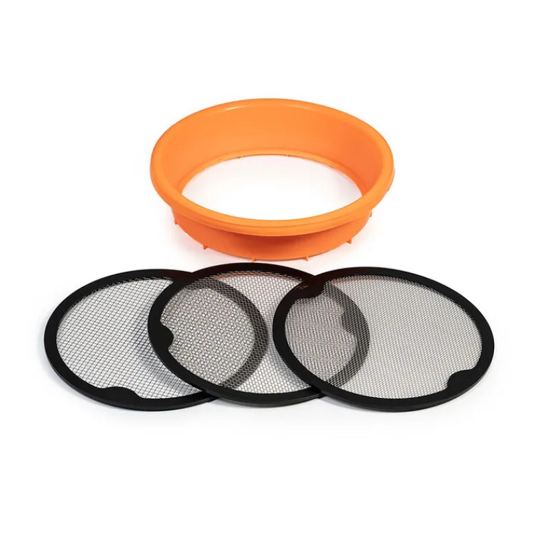 Le tamis se verrouille sur le seau, ce qui le rend sûr et stable, et extrêmement simple à utiliser. Le couvercle du seau se clipse également sur le tamis pour le fixer encore davantage. Cette caractéristique, unique à ce système, facilite grandement le transport du seau, du tamis et du couvercle, de manière efficace et sans risque de renverser le contenu.