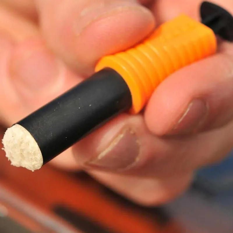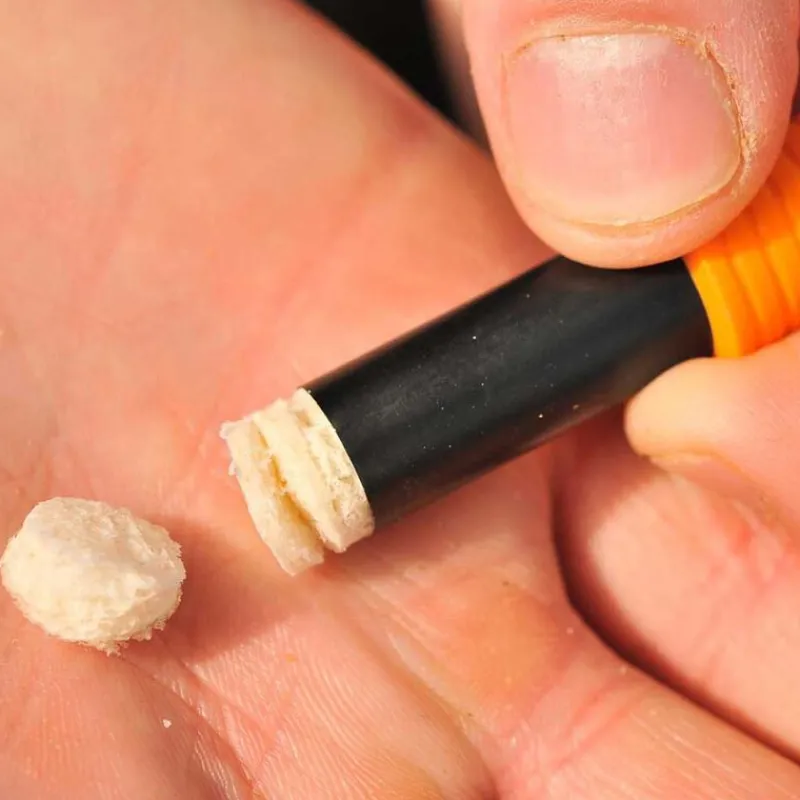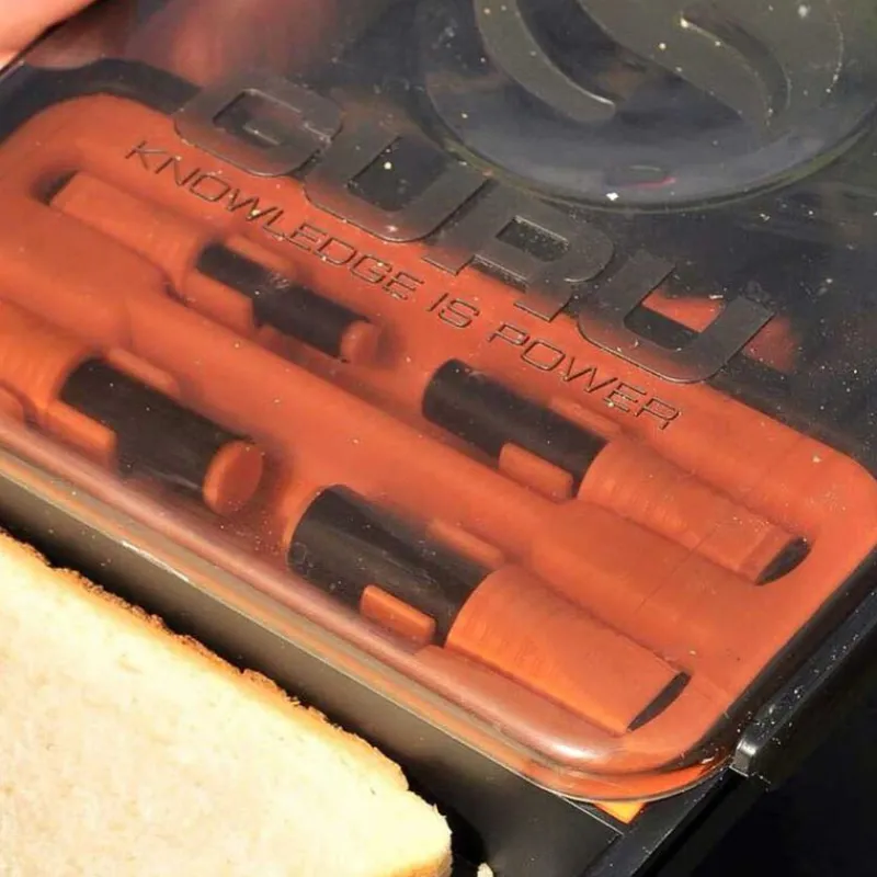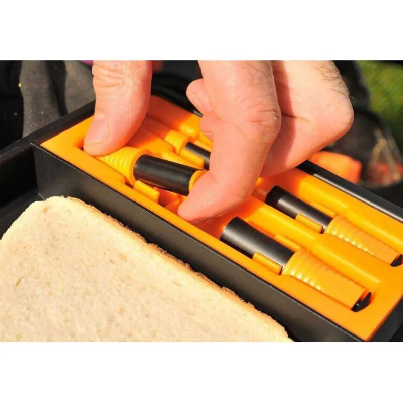 GURU a également travaillé sur le design de ce couvercle. Le but est de garder vos appâts en parfaite condition par temps pluvieux. Le couvercle est aussi teinté pour éviter que vos appâts ne se dessèchent sous les rayons du soleil. Lorsque vous ouvrez le couvercle, il se bloque à la hauteur de vos appâts. Si toutefois vous l’ouvrez entièrement, vous accédez au quatre emporte-pièces en acier inoxydable. Ils sont déclinés en 4 tailles de 6 mm, 8 mm, 10 mm et 12 mm qui couvrent de nombreuses situations de pêche, et vous permettent de « puncher » des appâts comme le pain, la viande ou encore les bouillettes. En déclipsant l’emporte-pièce, aussi appelé perforateur à poussoir, vous allez obtenir un objet compact et très pratique à utiliser : lorsque vous enfoncez l’emporte-pièce dans l’appât, le poussoir remonte, et en le pressant vous libérerez l’appât. Tous les emporte-pièces sont très tranchants, de façon à pouvoir perforer des appâts plus durs comme des bouillettes, du pâté dur ou de la saucisse : la coupure sera toujours parfaite et propre !