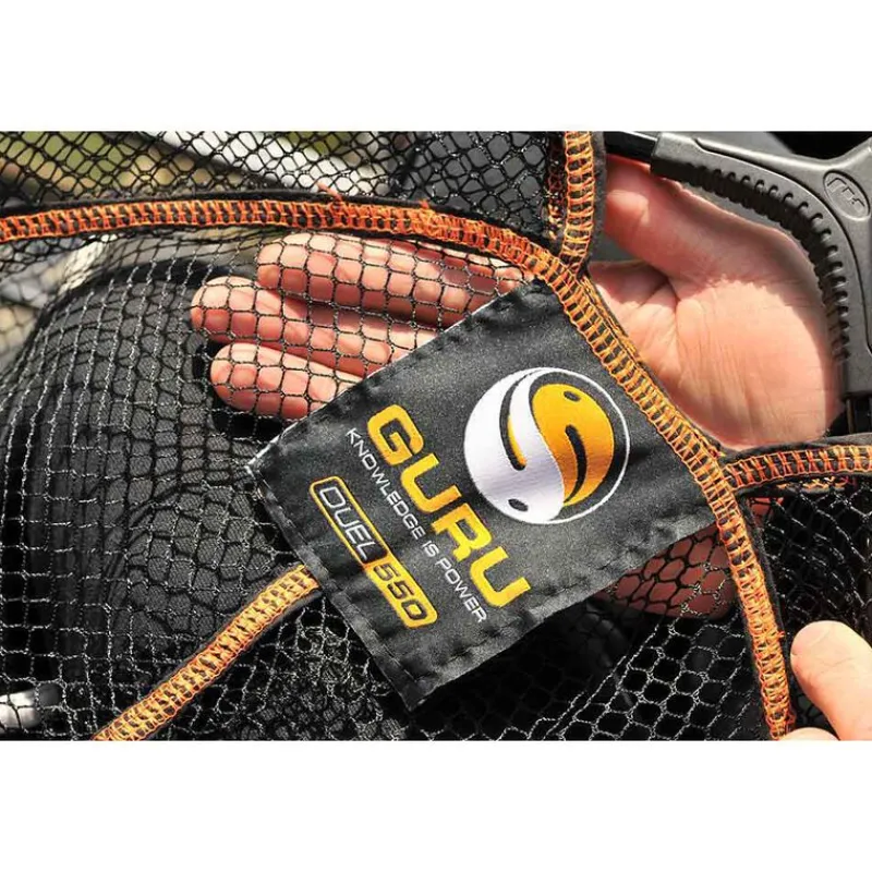 La nouvelle tête d’épuisette GURU DUAL 550 est construite autour d’une armature très solide en aluminium. Cette version avec une double maille de 6 mm sur les côtés et de 2 mm au fond est la plus grande de la gamme. D’un diamètre de 55 cm, le modèle DUAL 550 est particulièrement adapté à la pêche des gros spécimens en carpodrome.