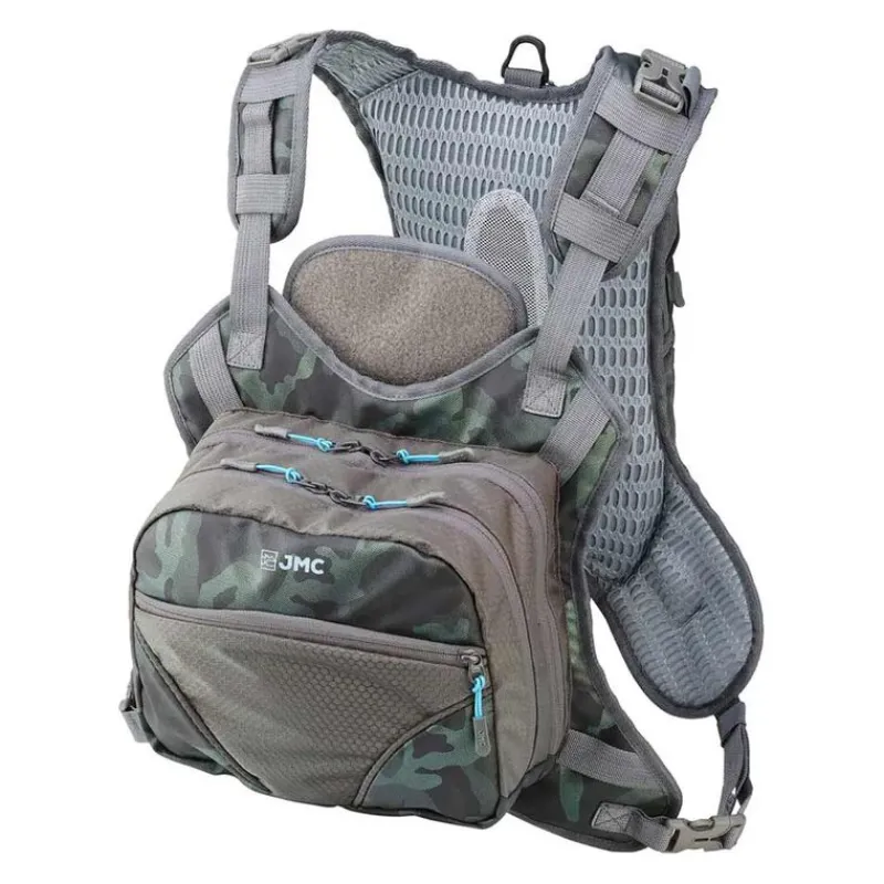 Ce grand chest-pack offre une grosse capacité de stockage avec deux grandes poches zippées YKK avant compartimentées plus une poche zippée plaquée sur l’avant. Le sac à dos détachable comprend une large poche doublée d’une poche plaquée zippée. On retrouve sur la partie avant et sur le sac à dos de nombreux suspenseurs, une large zone de patch velcro directement dérivée de notre célèbre chest-pack Compétition ainsi qu’un anneau D-ring dorsal pour accrocher votre épuisette. Toutes les zones en contact avec le corps sont réalisées en filet mousse pour une évacuation rapide de l’humidité. Tissu déperlant camo avec renforts en nid d’abeille. Taille unique pour toutes les morphologies avec réglage par sangles.