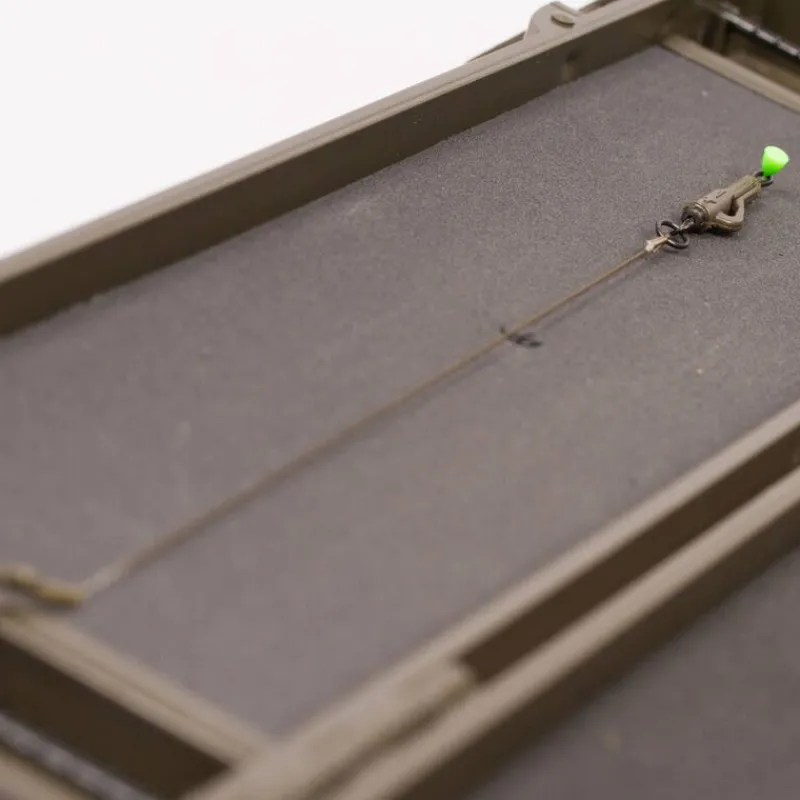 Afin de concevoir des bas de ligne à la longueur voulue, la face externe des boîtes à bas de ligne korda rig safe est munie d’une réglette graduée.