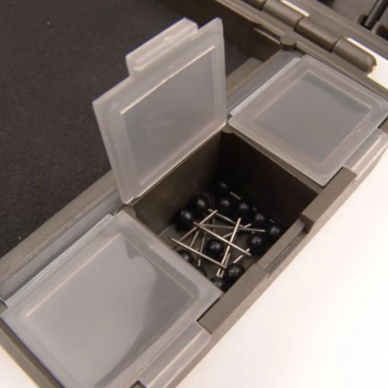 Les hameçons montés avec une gaine thermo, line aligner, les montages d-rig… pourront être stockés sans être déformés. En effet, sous la barre d’accroche, la forme incurvée de la coque abs autorise un rangement aisé pour ce type de montage. Il suffit simplement de ranger les hameçon avec la pointe vers le haut.