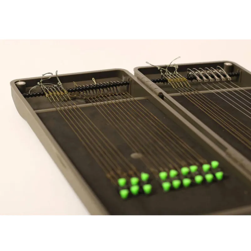 Les hameçons montés avec une gaine thermo, line aligner, les montages d-rig… pourront être stockés sans être déformés. En effet, sous la barre d’accroche, la forme incurvée de la coque abs autorise un rangement aisé pour ce type de montage. Il suffit simplement de ranger les hameçon avec la pointe vers le haut.