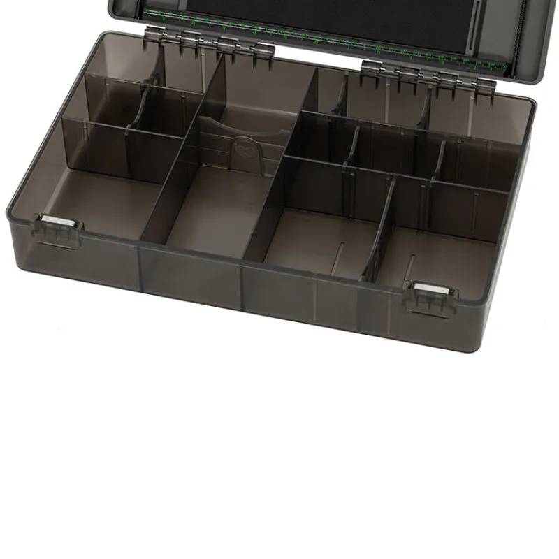 La partie principale offre une grande capacité avec des séparateurs ajustables (6 petits, 1 moyen, 2 grands), permettant de personnaliser complètement vos espaces de rangement. Les dimensions fixes accueillent parfaitement les Hooklink Spools, Accessory Boxes, Kamakura Hook Boxes, Bait Floss, Leader Safes, Arma Kord, ou encore vos aiguilles et ciseaux.