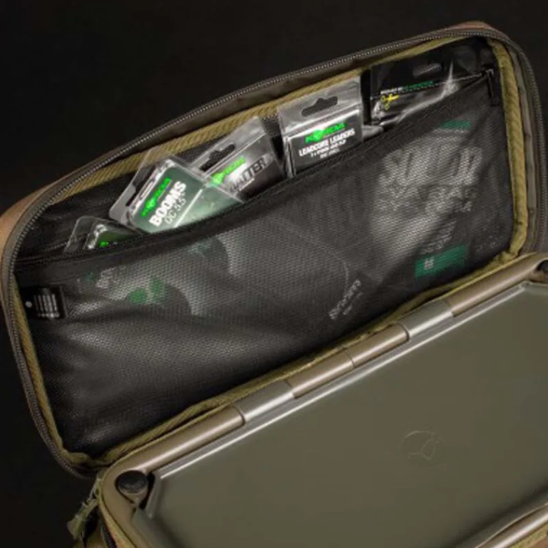 La poche avant est suffisamment grande pour accueillir une Korda Tackle Box, contribuant ainsi à maximiser l’espace dans le compartiment principal. La poche avant est fournie avec deux organisateurs internes qui peuvent être configurés pour répondre à vos besoins individuels, tandis que les poches d’extrémité comportent des ports moulés pour un accès facile aux câbles de chargement.