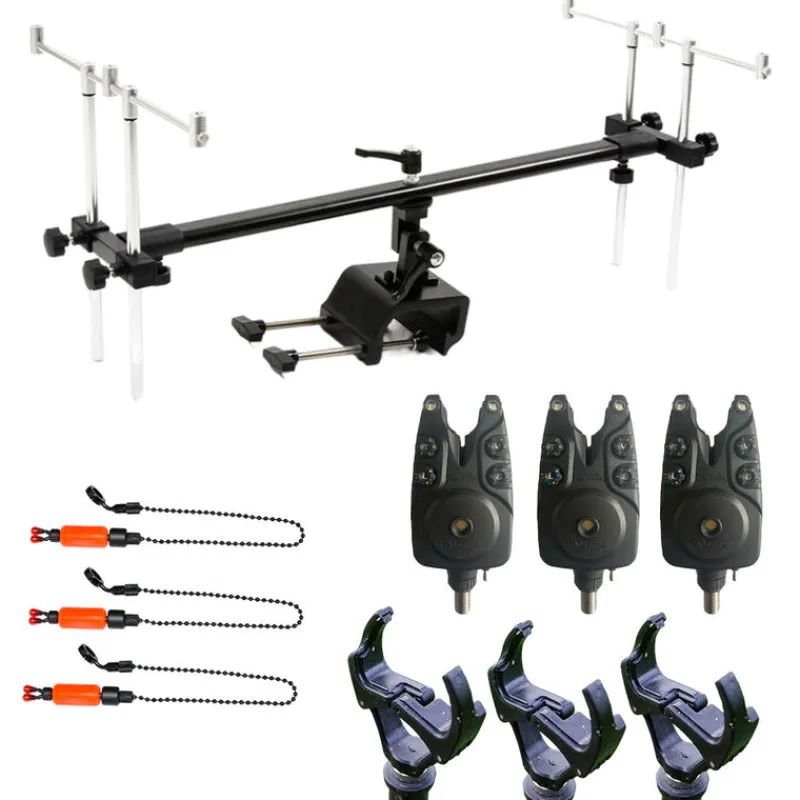 Un pack pour la pêche depuis un bateau avec un rod pod qui s’adapte uniquement sur une embarcation ainsi que 3 détecteurs, 3 supports arrières et 3 hangers.