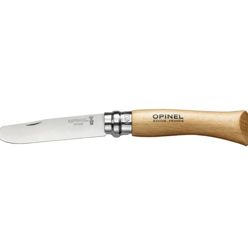 - Manche: Le hêtre est le bois le plus utilisé pour la fabrication des manches Opinel. Issu d’exploitations françaises, il est dur, résistant et facile à travailler. D’un aspect homogène, sa couleur claire varie du jaune au rosé. Il est reconnaissable par la présence de nombreux petits traits sombres. Le manche est verni pour être mieux protégé contre l’humidité et les salissures.