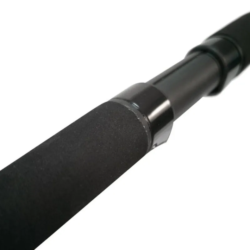Caractéristiques de la canne : longueur 3.60m, puissance jusqu’à 70g, canne en 2 éléments, 13 anneaux, poignée en duplon, canne en carbone, blank fin et puissant, encombrement 1.55m, poids 185g.