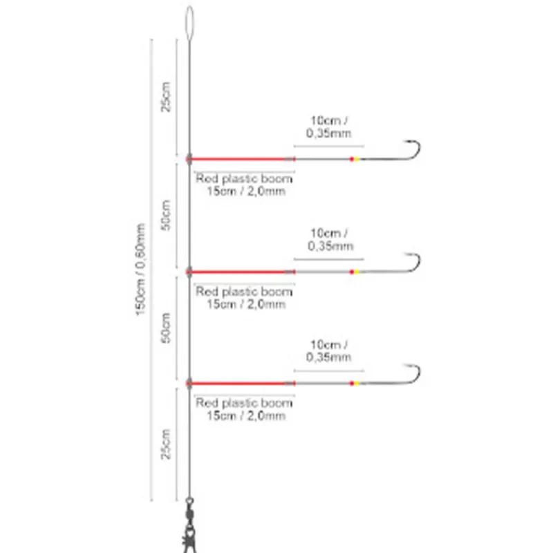 Ces paternosters de Spro sont très faciles à utiliser. Vous attachez la ligne à votre ligne principale, mettez votre appât sur les hameçons tranchants comme des rasoirs et vous êtes prêt à pêcher. Le bas de ligne est fait à la main à partir d’un fluorocarbone solide qui rend la ligne presque invisible sous l’eau. Les perles réfléchissantes sur les lignes latérales rendent votre appât très attrayant et attirent rapidement l’attention des poissons. Les hameçons en plastique rouge garantissent que votre appât ne s’entortille pas dans votre ligne. Vous pouvez utiliser ces bas de ligne pour pêcher depuis un bateau ou depuis le rivage.