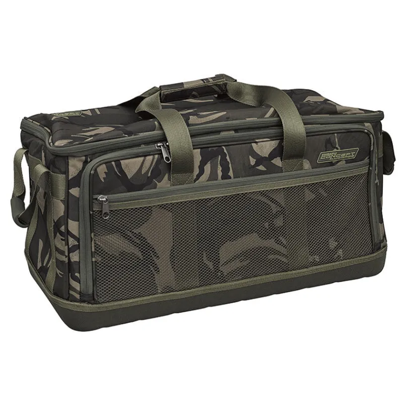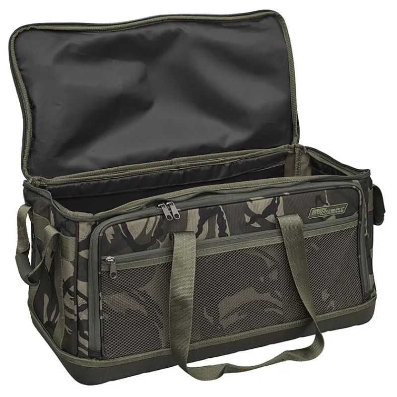 Côté praticité, l’accès est optimisé avec une ouverture classique par le haut, mais aussi une ouverture frontale permettant d’atteindre facilement les pochettes rangées au fond du sac, sans devoir tout vider. Enfin, sa hauteur a été étudiée pour se glisser facilement sous un bed chair, un détail très utile pour gagner de la place dans le bivvy.