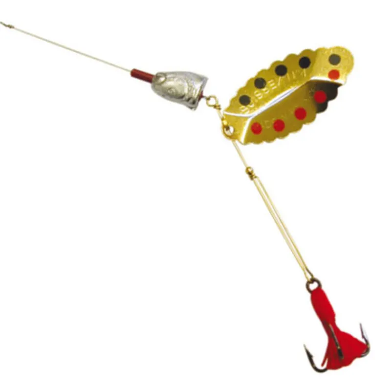 Une cuillère tournante Suissex de couleur doré avec un lest à l’avant et un marqueur visuel rouge sur le triple.