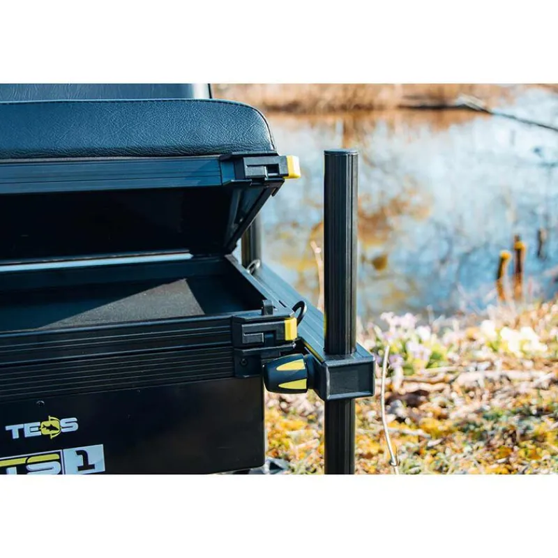 La station TS1 SEATBOX est le modèle le plus léger et le plus compact de la gamme. Son poids plume de 8.5 Kg la rend très facile à transporter. Elle dispose pour cela de 4 pieds fixes en D30 qui offrent un excellent compromis entre légèreté et stabilité. Son assise est dotée d’un dossier repliable qui assure un excellent maintien des lombaires pour un confort accru en action de pêche. Elle est équipée d’origine d’un bac profond sous l’assise qui permet de stocker facilement les accessoires plus volumineux tels que les coupelles, les frondes ou même les appâts/amorces. Son tiroir latéral de 30mm de profondeur permet quant à lui d’avoir un accès facile à vos petits accessoires en cours de pêche : il est parfait pour accueillir vos plombs, hameçons, sondes ou encore vos outillages tels que des ciseaux ou votre pince à plombs.